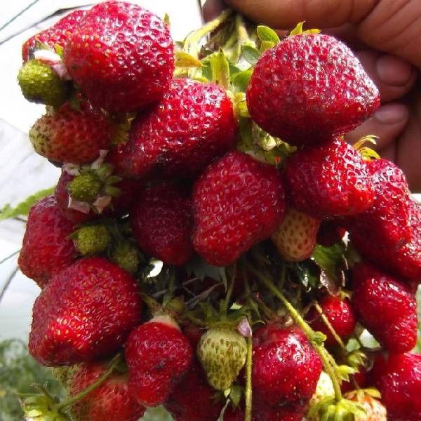 КлубникаКлубника – название растений и их плодов (ягод, многоорешков) некоторых видов рода Земляника (Fragaria), а также распространённое разговорное название всех крупноплодных видов этого рода. Листья тройчатые, сложной формы, на длинных, достигающих высоты в 10 см стебельках; побеги ползучие, укореняющиеся. Корневая система мочковатая, глубина залегания корней – 20-25 см. Соцветие – многоцветковый щиток. Цветки, как правило, обоеполые, опыляются насекомыми, располагаются на длинных цветоносах, которые отходят розеткой от корневой шей-ки. Лепестки обычно белые, иногда желтоватые; много тычинок и пестиков. Плоды земляники – апокарпные (то есть сложные, или сборные), представляют собой ложные ягоды (многоорешки) типа фрага, или земляничина. Мелкие коричневатого цвета семена находятся на поверхности разросшегося сочного цветоложа. Цветение земляники в средней полосе Европейской части России продолжается с конца мая до начала созревания плода (обычно начало июля).